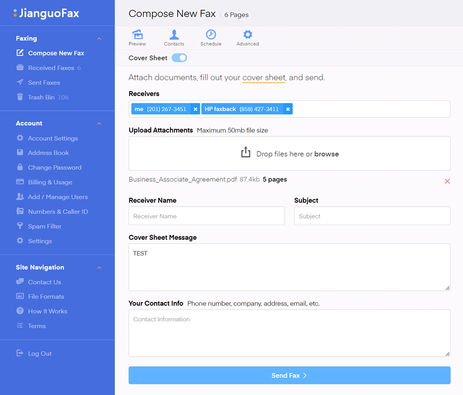 Navigate to the compose new fax section in your dashboard. Drag and drop your attachments (or use the camera on your phone) to send faxes to one or more recipients. Create contact lists in the address book section and send faxes to multiple destinations with a single click.